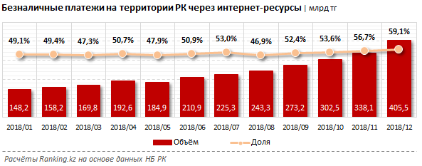 Наибольшие объёмы были зафиксированы в декабре - 405,5 млрд тенге, что составило 59,1% от всех безналичных платежей, в ноябре - 338,1 млрд тенге и октябре - 302,5 млрд тенге.