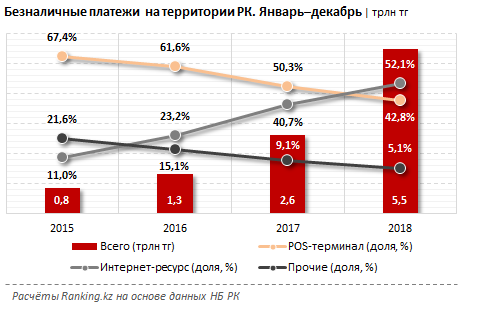 Безналичные платежи через интернет за 2018 год достигли 2,9 трлн тенге - в 2,7 раза больше, чем в прошлом году, что позволило им занять долю в 52,1% от всего объёма безнала.