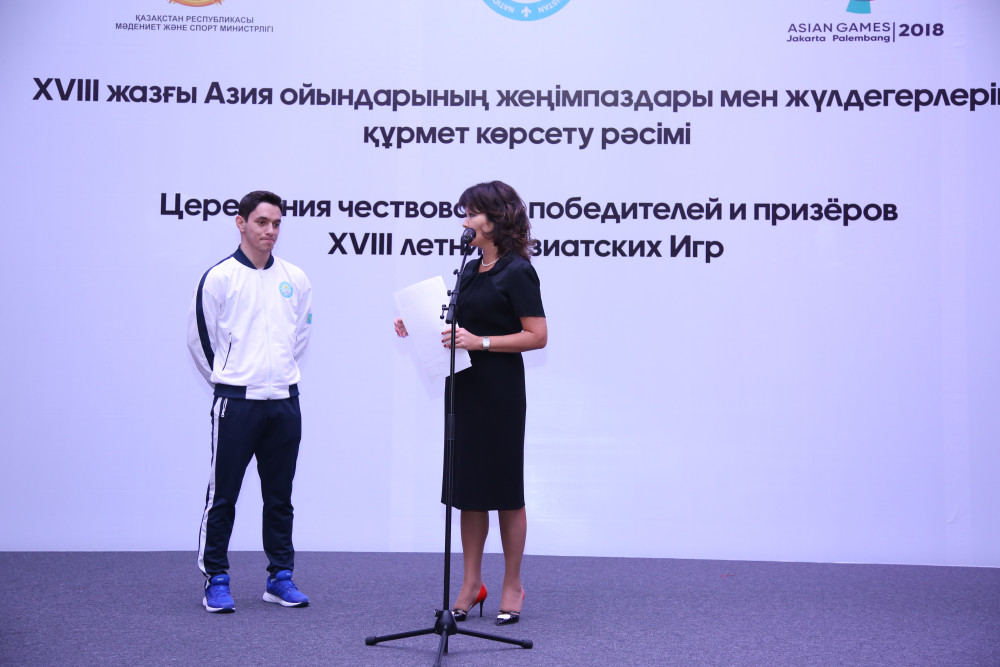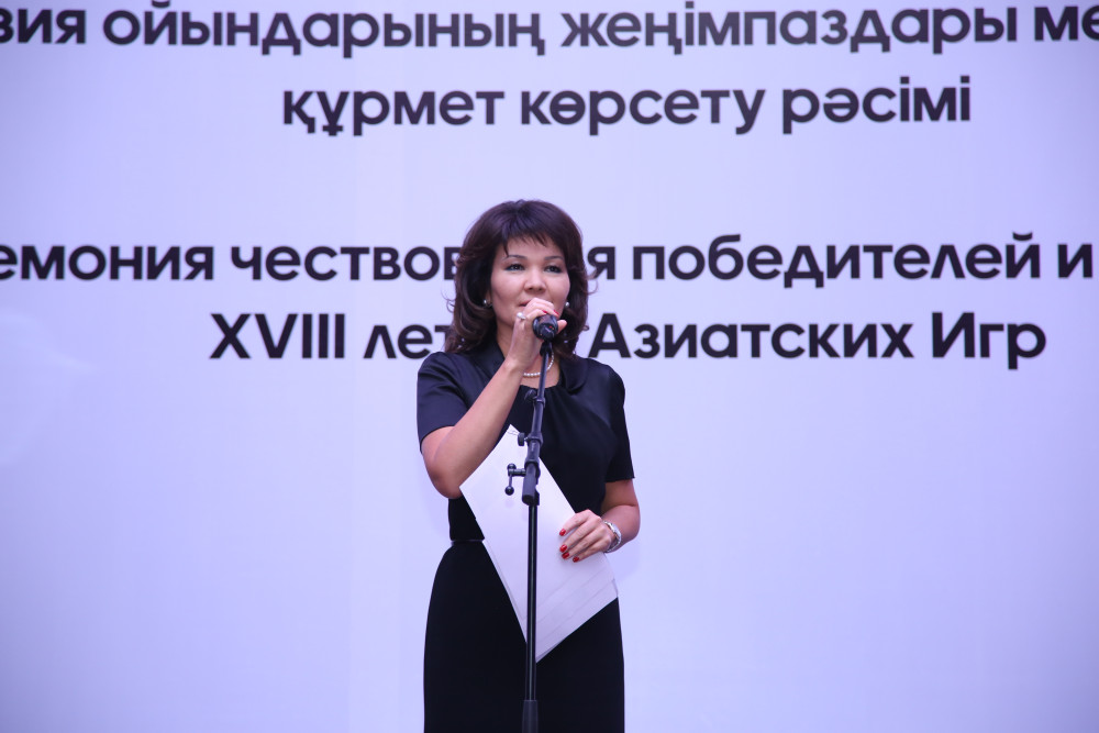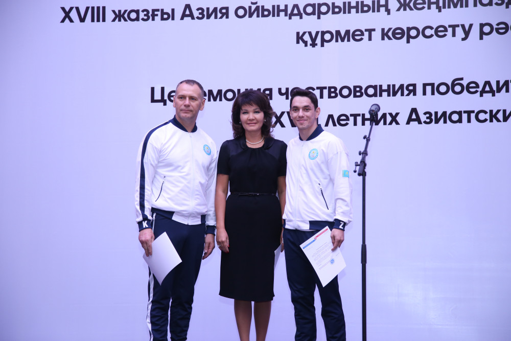 В Алматы во время церемонии чествования казахстанских победителей и призёров летних Азиатских игр-2018 президент Федерации гимнастики РК Умут Шаяхметова вручила дополнительные премии гимнастам, сообщает корреспондент BNews.kz.
