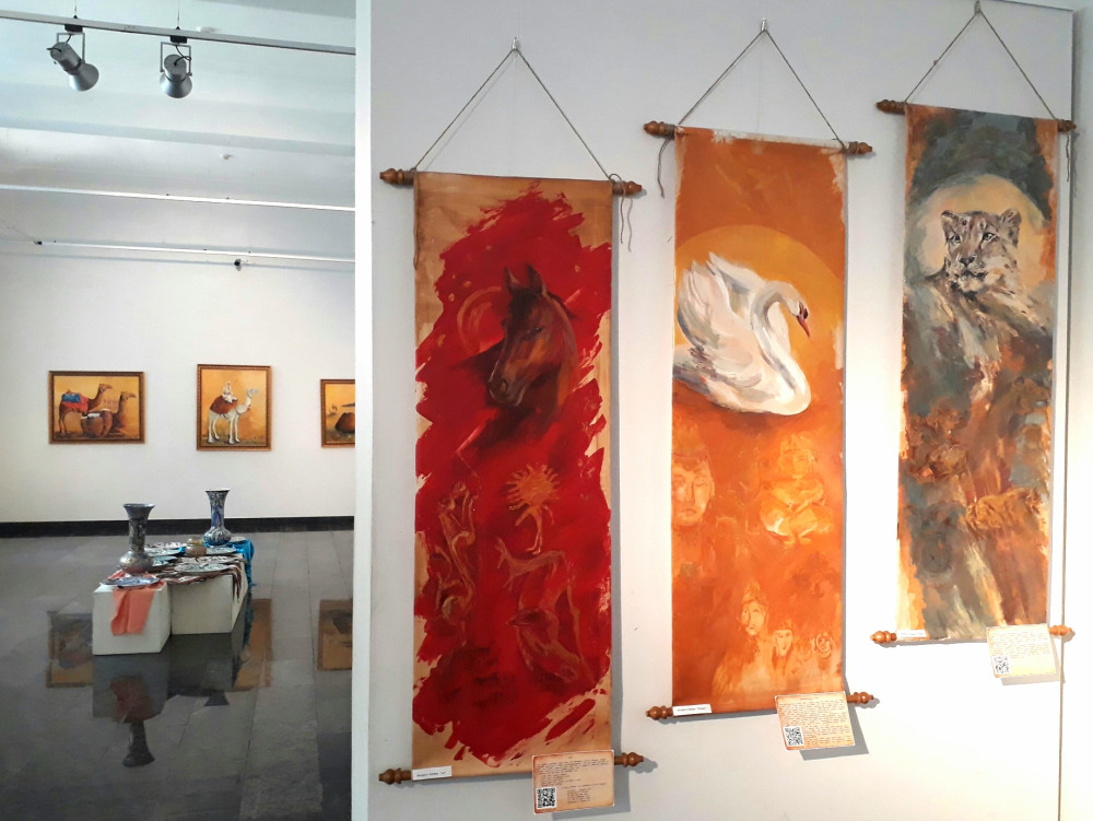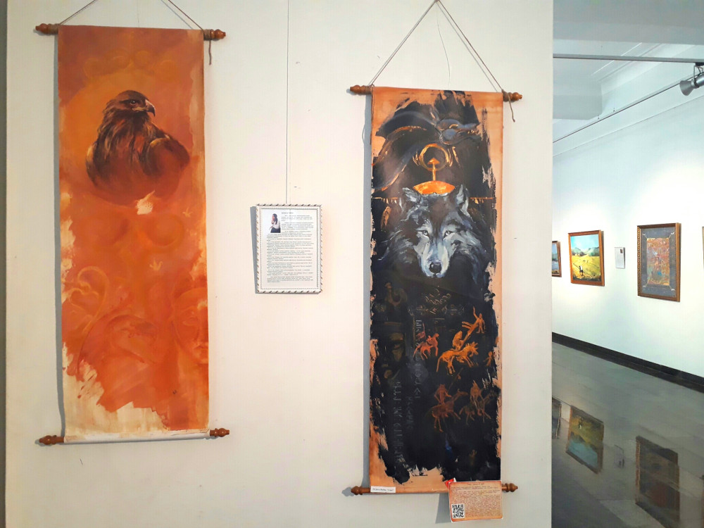 «На выставке «Туран» представлены пять моих работ. В работах я изобразила тотемных животных, божеств, которым поклонялись тюрки. Небесные тюрки поклонялись небу – великому Тенгри. Тенгри олицетворялся в виде волка (Кок Бори). Далее изобразила Лебедя. Богиня плодородия Умай - жена Тенгри олицетворялась в образе лебедя. Беркут – сын Тенгри, могущественная птица, око бога. Барс – повелитель гор. Горы для тюрков были священными. Алтай – пуп земли. Лошадь – стихия огня. В переводе с казахского языка «ат» означает «огонь». Тюрки очень почитали лошадей, с их помощью они могли завоевать полмира. Работы исполнены на холсте размером 155х55 см и оформлены в виде древних свитков», - рассказала корреспонденту BNews.kz Руфина Шарипова.
