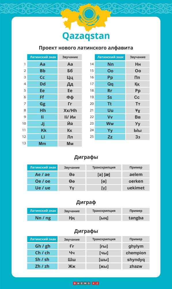«При создании нового алфавита на латинской графике за основу был взят такой принцип: одна буква – один звук, одна буква – два звука и один звук, система диграфа. Для полноценного обеспечения звуковой системы казахского языка в алфавит было включено 8 диграфов, обозначающих восемь специфических звуков. Три казахских главных фонемы – это мягкие ә, ү, о, - обозначаются диграфами, например звук «ие» в сочетании с твердыми гласными звуками а, у, э, дают звуки ә, ү, о, звук ә передается диграфом «ай и», - рассказал директор республиканского координационно-методического центра развития языков им. Ш.Шаяхметова Ербол Тлешов.