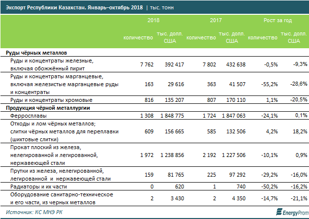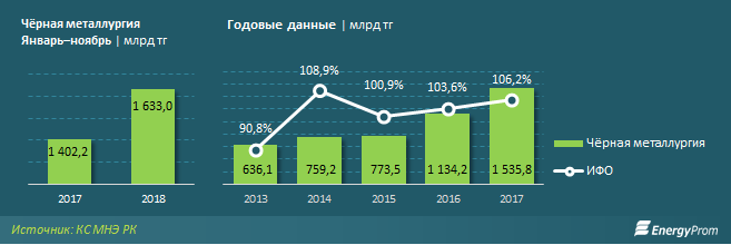 Объёмы чёрной металлургии за указанный период выросли в деньгах на 16,5%, до 1,6 трлн тенге. Производство сконцентрировано в Карагандинской (42,6%), Павлодарской (29,1%) и Актюбинской (19,4%) областях.