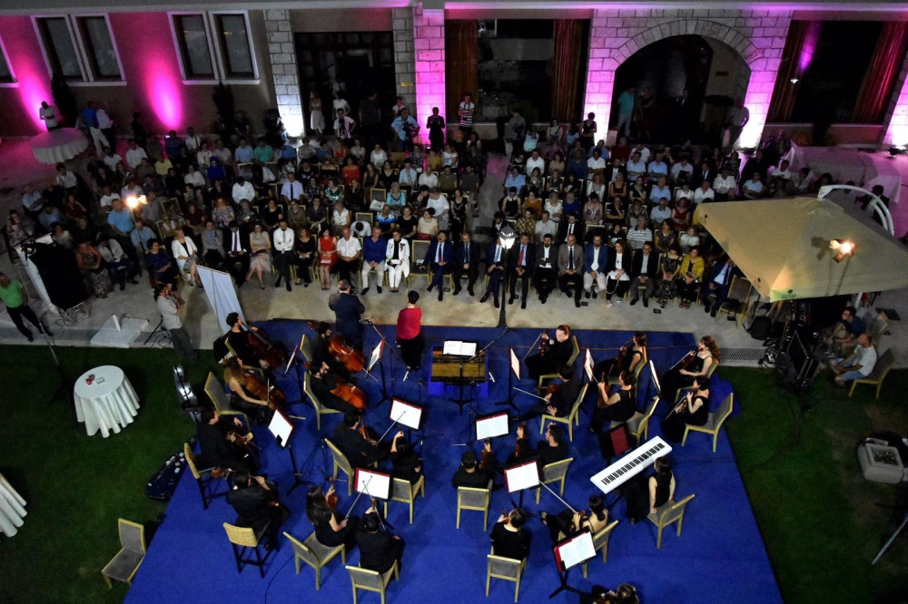 Первый концерт артисты дали в македонской столице Скопье. В программе концерта, посвященного 25-летию установления дипломатических отношений между тюркскими государствами, оркестр под руководством дирижеров Анвара Акбарова (Казахстан) и Мустафы Мехмандарова (Азербайджан) исполнил произведения мировой классики и сочинения современных композиторов тюркских стран. Так, в репертуар оркестра вошли произведения классика азербайджанской музыки 20 века Фикрета Амирова, кыргызского композитора Сеитали Медетова, туркменского композитора Ровшана Непесова, башкирского композитора Азамата Хасаншина, татарского композитора Алсу Сунгатуллиной и композитора из Турции Тургая Эрденера. Кроме того, состоялось премьерное исполнение сочинения казахского музыканта Биржана Мынбаева «Илигай».