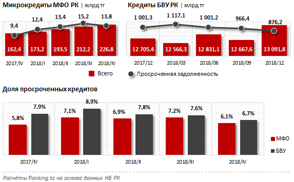 Объём микрокредитов МФО РК на конец 2018 года составил 226,8 млрд тг, увеличившись за четвёртый квартал на 6,9%, за год — на 39,6%. Для сравнения: кредиты БВУ РК за период с конца сентября по конец декабря 2018 года выросли на 3,3%, за год — на 3%, до 13,1 трлн тг.