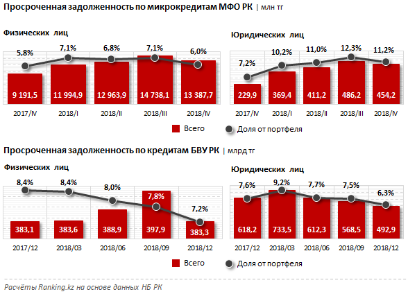 Почти 97% просроченных микрокредитов МФО РК — по займам, выданным физическим лицам: 13,4 млрд тг — на 45,7% больше, чем на конец 2017 года. При этом за четвёртый квартал 2018 года (к третьему кварталу) объём просрочки сократился на 9,2%. Доля плохих кредитов физлиц в портфеле составляет 6%.