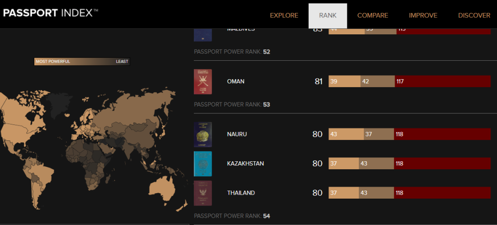 По итогам рейтинга, составленного порталом Passport Index казахстанский паспорт занял 53 место в рейтинге самых влиятельных паспортов мира 2018 года, передаёт Bnews.kz со ссылкой на Passport Index.