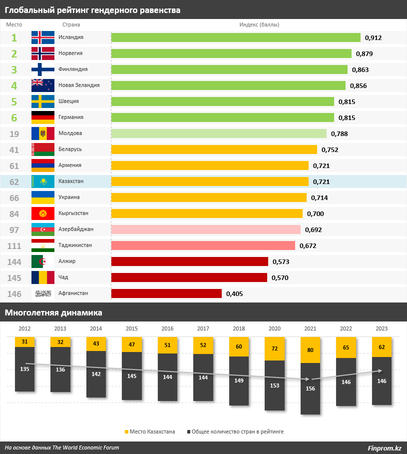 Проблемы гендерного равенства остаются для Казахстана весьма актуальными. Так, из 146 стран, попавших в глобальный рейтинг гендерного равенства, Казахстан занял лишь 62-е место.