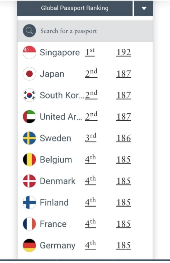 Возглавляет рейтинг Сингапур с доступом к 192 странам - мировой рекорд. На втором месте Япония и Южная Корея (188 направлений), на третьем Швеция (186). В топ-4 расположилась группа из 12 европейских государств с показателем 185 стран: Бельгия, Дания, Финляндия, Франция, Германия, Ирландия, Италия, Люксембург, Нидерланды, Норвегия, Испания и Швейцария.