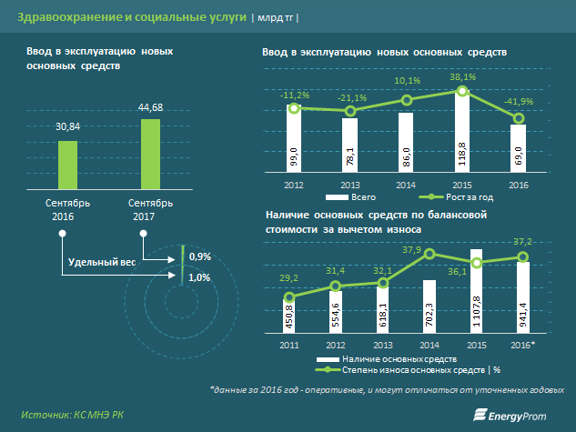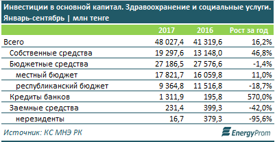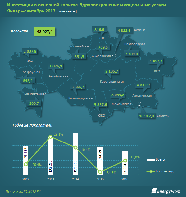Объем инвестиций в основной капитал в сфере здравоохранения и социальных услуг с начала года составил 48 млрд тенге, что на 16,2% больше, чем в аналогичном периоде 2016 года, говорится в исследовании, опубликованном на сайте energyprom.kz.