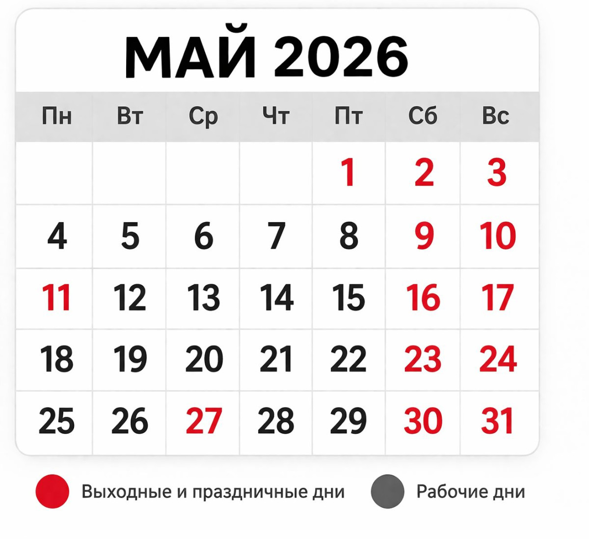 Праздничные даты (1, 7, 9 и 27 мая) остаются выходными, однако большинство суббот - рабочие.