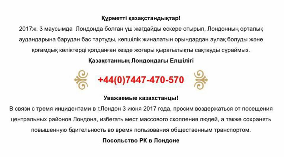 «Просим воздержаться от посещения центральных районов Лондона, избегать мест массового скопления людей, а также сохранять повышенную бдительность во время пользования общественным транспортом», – указано в информации посольства РК в Лондоне.