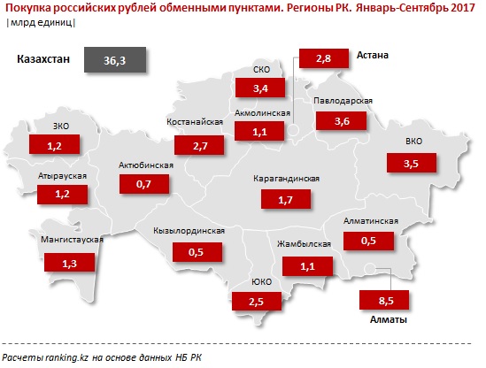 По объему купленных обменными пунктами у казахстанцев российских рублей преобладают регионы, граничащие с Россией, за исключением города Алматы, который лидирует с 8,5 млрд RUB, как финансовый центр страны.