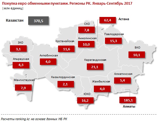 На первом месте по объему купленных у населения евро Алматы - 185,1 млн EUR, что составляет половину объема от РК. Следом идет Астана - 62,4 млн EUR, доля от РК - 16,9%. На третьем месте Карагандинская область с объемом 21,1 млн EUR и долей от РК - 5,7%.