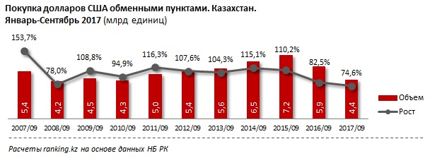 Покупка долларов обменными пунктами РК за январь-сентябрь 2017 года сократилась на 25,4%, по сравнению с аналогичным периодом прошлого года и составила 4,4 млрд долларов - самый низкий показатель с 2010 года, когда за январь-сентябрь было куплено обменными пунктами долларов на сумму 4,3 млрд. Об этом сообщает ranking.kz.