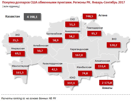 Почти половина купленных обменными пунктами долларов приходится на Алматы - 49,4% или 2,2 млрд USD. Следом идет Астана - куплено обменными пунктами 748,5 млн долларов. Доля от РК 17%. Замыкает тройку лидеров ЮКО - 337,3 млн долларов, доля от РК - 7,7%.