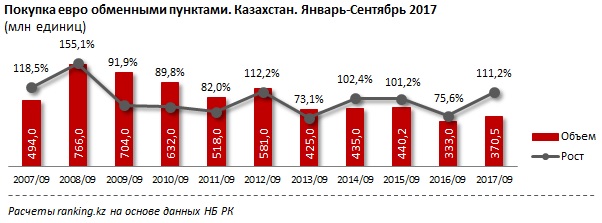 Объем купленных у населения евро в январе-сентябре 2017 года составил 370,5 млн, что на 11,2% больше по сравнению с аналогичным периодом прошлого года. Годом ранее, наоборот, наблюдался спад - на 24,4%, до 333 млн евро.