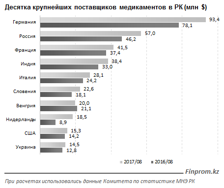 Лидером на рынке импорта медикаментов в Казахстан по-прежнему является Германия, препараты немецкого производства в этом году составили 17,8% ввоза, или $93,4 млн. За год сумма импорта немецких медикаментов в страну увеличилась сразу на $15,3 млн.