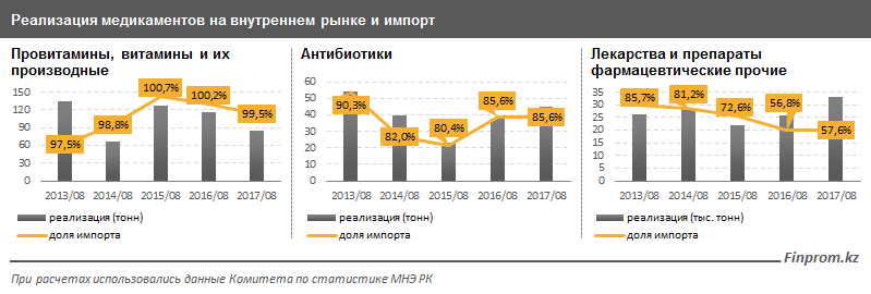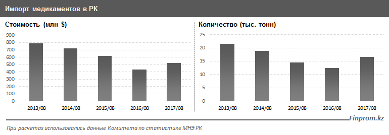 В документе отмечается, что импортеры медикаментов пытаются восстановить свои позиции на казахстанском рынке. За январь-август текущего года в Казахстан ввезено 16,6 тыс тонн лекарств, или на 32,9% больше, чем за аналогичный период 2016 года. Таким образом, объем импорта медикаментов превысил уровни не только 2016, но и 2015 года (14,6 тыс тонн за 8 месяцев).