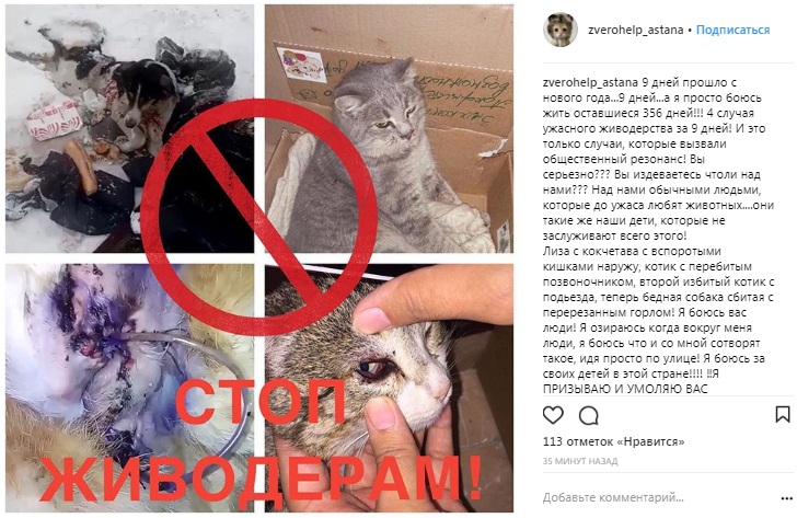 В своей петиции защитники животных приводят несколько примеров живодерства в Казахстане, вызвавших общественный резонанс. Они отмечают, что только с начала 2018 года в стране зафиксировано уже четыре случая жестокого обращения с животными: кошка со вспоротым животом, кот с перебитым позвоночником и ещё один избитый, а также сбитая обака с перерезанным горлом.