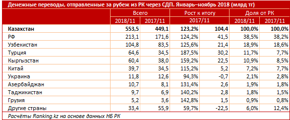 Объём денежных переводов, отправленных из РК за рубеж через системы денежных переводов с января по декабрь 2018 года, составил 553,5 млрд тенге, что на 23,2% больше, чем в аналогичном периоде 2017 года, говорится в исследовании ranking.kz.
