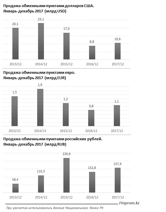 "Долларов было куплено на 20% больше, чем годом ранее, рублей - на 19%, евро - сразу на 29%. За 2017 год казахстанцы купили в обменных пунктах страны 10,6 млрд долларов США, 1,1 млрд евро и 157,9 млрд рублей. Покупка долларов США за год выросла на 19,9%, евро - на 29,1%, российских рублей - на 18,9%", - отмечают эксперты.