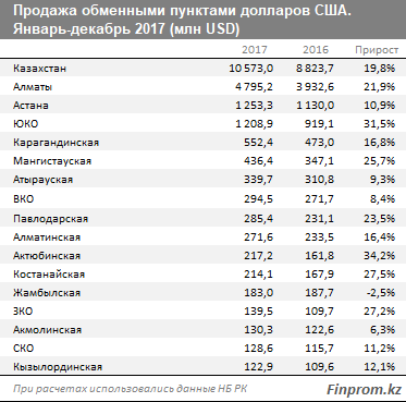 Единственным регионом, где за год объем купленных в обменниках долларов уменьшился, стала Жамбылская область - минус 2,5%, до 183 млн USD. Объем евро, купленных в обменных пунктах, увеличился по всему Казахстану.