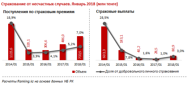 "Поступления по страховым премиям в сегменте добровольного страхования от несчастных случаев за год выросли на 50,9% и составили за январь 2018 года 733,5 млн тг. Это уже 7% (годом ранее 5,2%) от собранных премий по добровольному личному страхованию. Объем выплат за год вырос сразу в 2,8 раз, до 80,9 млн тг. Доля выплат в секторе от добровольного личного страхования за год выросла с 1% до 3%", - отмечают аналитики.