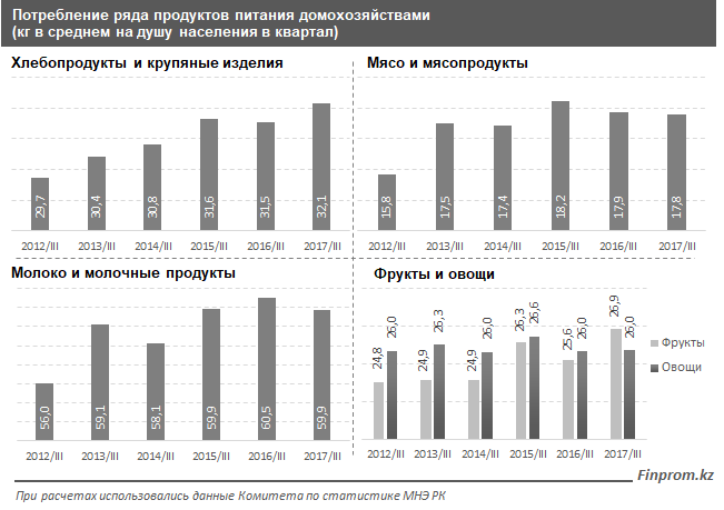 При этом резко сократилось потребление картофеля - на 4,2% по сравнению с III кварталом 2016 года, молока и молочных продуктов - на 1%, мяса и мясопродуктов в РК стали есть меньше на 0,5%.