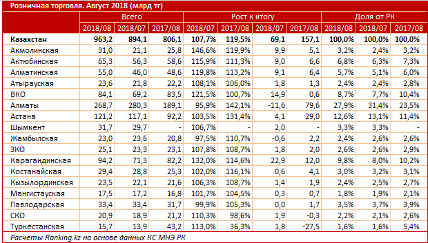 В августе казахстанцы потратили в точках розничной торговли 963,2 млрд тенге - на 7,7% больше, чем в июле, и сразу на 19,5% больше, чем год назад, передаёт BNews.kz со ссылкой на ranking.kz.