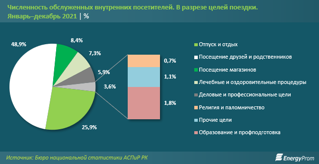 И, наконец, есть и такие важные данные: в 2021 году эксперты БНС АСПиР РК провели обследование, в ходе которого уточнили у казахстанцев цели их поездок. Оказалось, что 48,9 процента внутренних туристов ездили просто в гости к родным и друзьям, 5,9 процента были в поездках по работе, а 8,4 процента уезжали за пределы своего города ради шопинга. Тех, кто ездили в отпуск, на отдых, в санаторий или на курорт, оказалось всего 33,2 процента.
