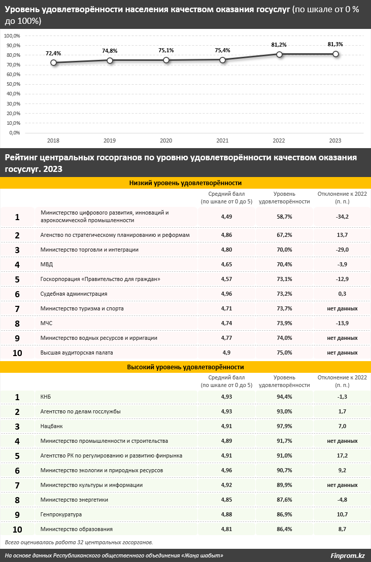 Согласно методологии, около 10 тыс. казахстанцев, принявших участие в опросах, ставили общую оценку госорганам по пятибалльной шкале и оценивали степень удовлетворённости той или иной услугой в процентах. В целом, средний балл у всех 32 центральных госорганов в прошлом году был выше 4. В рейтинге центральных государственных органов самый низкий показатель удовлетворённости казахстанцев продемонстрировало Министерство цифрового развития, инноваций и аэрокосмической промышленности. Оказалось, что получатели услуг в Минцифры довольны качеством только на 58,7%. В сравнении с 2022 годом степень удовлетворённости упала сразу на 34,2 п. п. На втором месте среди аутсайдеров — Агентство по стратегическому планированию и реформам (АСПиР). Для этого госоргана степень удовлетворённости в 67,2% — это даже достижение. Годом ранее казахстанцы оценивали качество услуг АСПиР ещё хуже — на 53,5%. В пятёрку госведомств, работой которых респонденты оказались недовольны больше всего, попали также МВД (70,4%) и Госкорпорация "Правительство для граждан" (73,1%).