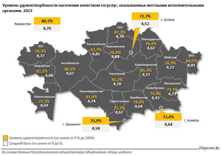 Что касается местных исполнительных органов, здесь степень удовлетворённости населения в прошлом году не достигала даже 90%. Средний показатель по стране — 80,1%, а средний балл — 4,7. Максимально высокая цифра — 86,5% — у акимата Актюбинской области, хотя общая оценка работы этого ведомства была не лучшей (4,67 из 5 возможных баллов). В лидерах также оказались Восточно-Казахстанская (84,5%), Костанайская (83,7%) и Северо-Казахстанская (82,3%) области.