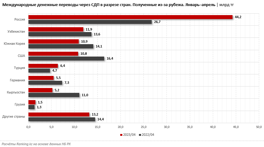 По полученным из-за рубежа денежным средствам среди стран-отправительниц лидирует Россия, на которую пришлось 40,4 процента всего отправленного в стране объёма средств: 44,2 миллиарда тенге, на 65,6 процента больше, чем за январь–апрель 2022 года.