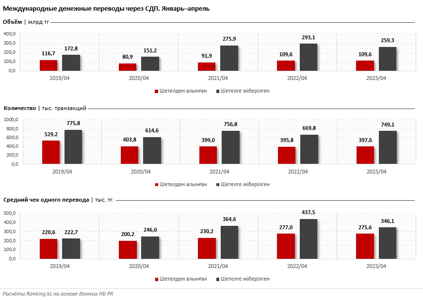 Совокупный объём средств, отправленных за рубеж и полученных из-за рубежа при помощи международных систем денежных переводов, за январь–апрель текущего года составил 368,8 миллиарда тенге, передаёт BaigeNews.kz со ссылкой на ranking.kz. Из них 259,3 миллиарда тенге пришлись на переводы, отправленные за рубеж - это на 11,5 процента меньше, чем годом ранее. При этом количество транзакций выросло на 11,8 процента, до 749,1 тысячи. Средний чек одного перевода, отправленного за рубеж через систему денежных переводов, уменьшился за год с 437,5 до 346,1 тысячи тенге.