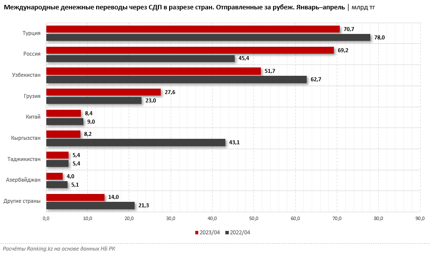 Среди стран по объёму отправленных из страны денег за январь–апрель текущего года лидирует Турция: 70,7 миллиарда тенге, что на 9,4 процента меньше, чем за январь–апрель прошлого года. Следом идёт Россия, причём здесь объём переводов из Казахстана вырос более чем в полтора раза за год, до 69,2 миллиарда тенге. Замыкает тройку стран-лидеров Узбекистан: 51,7 миллиарда тенге, минус 17,7 процента за год.