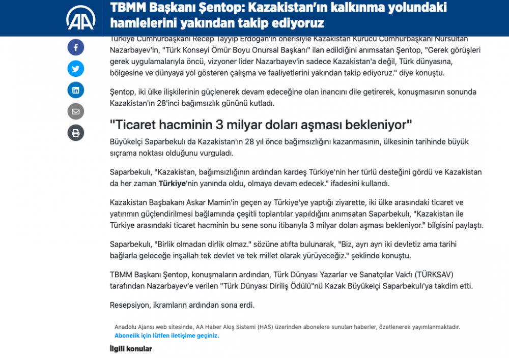 Мустафа Шинтоп признался, что всегда гордился тем, что Турция является первой страной, признавшей независимость Казахстана, и отметил особые отношения между двумя республиками. Он также добавил, что Турция внимательно следит за развитием Казахстана.