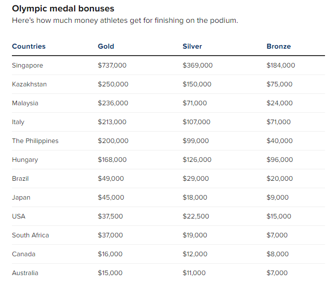 CNBC составил таблицу призовых, основываясь на информации от национальных олимпийских комитетов, спортивных ассоциаций и сайта личных финансов Money Under 30.