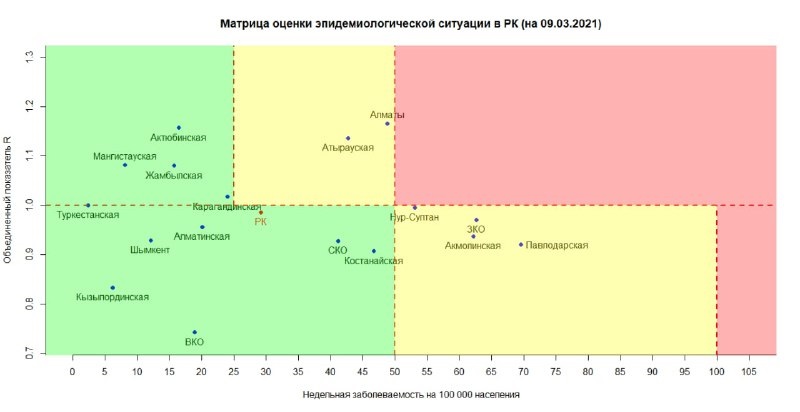 Опубликована матрица оценки эпидемиологической ситуации по коронавирусу в регионах Казахстана на 9 марта 2021 года, передает BaigeNews.kz.