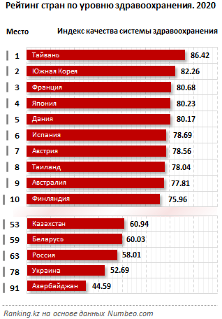 У Казахстана самый высокий индекс качества системы здравоохранения среди стран СНГ. Показателям РК уступают Беларусь (59-е место), Россия (63-е место), Украина (78-е место) и Азербайджан (91-е место).