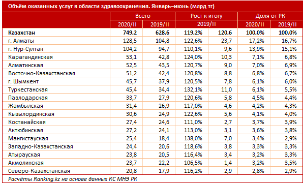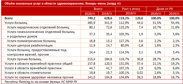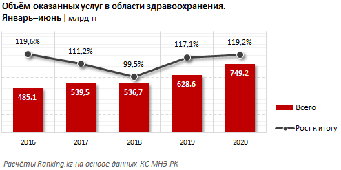 За январь–июль 2020 года в стране оказали услуг в области здравоохранения на сумму 749,2 миллиарда тенге – на 19,2 процента больше, чем годом ранее. В том числе 80,4 процента услуг было оказано за счёт бюджета, 11,8 процента – за счет населения, 7,8 процента – за счёт предприятий.