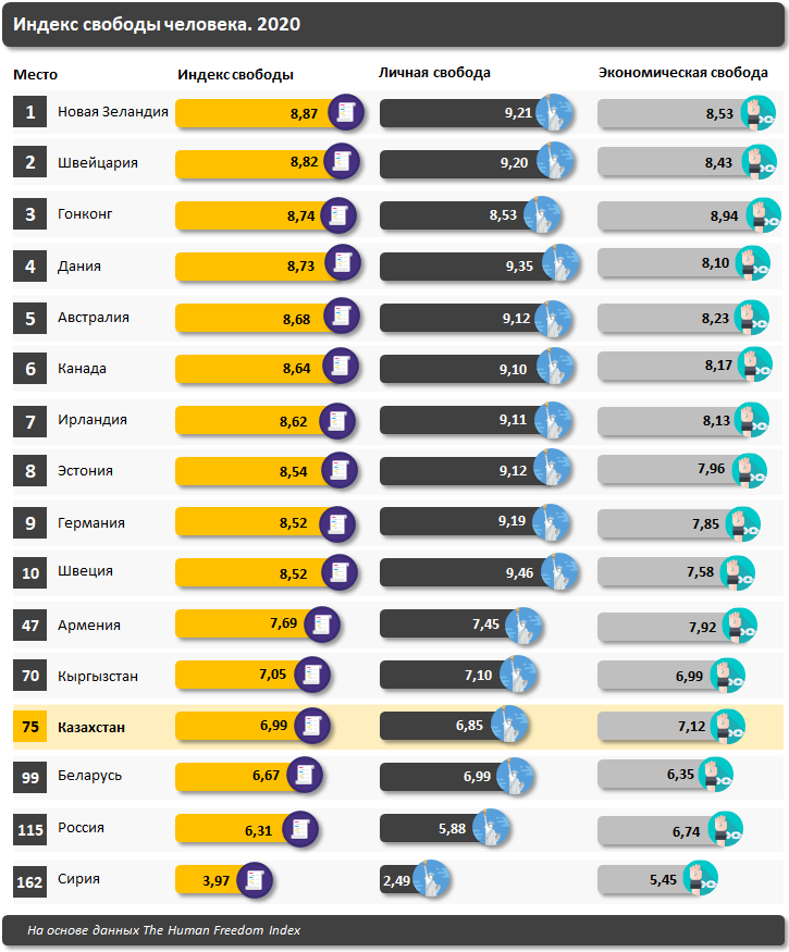 В рейтинге стран по индексу свободы человека Республика Казахстан заняла 75-е место в мире из 162 стран-участниц. Для Казахстана индекс составил 6,99. Это ниже, чем у таких стран, как Армения и Кыргызстан, но выше, чем у Беларуси и России, передает BaigeNews.kz со ссылкой на finprom.kz.