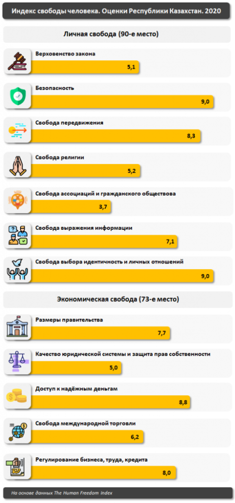 "Первые семь сфер учитываются в индексе личной свободы, по этому индексу Казахстан занимает 90-е место в рейтинге. Последние пять сфер учитываются в индексе экономической свободы, здесь РК занял 73-е место. По индексу личной свободы у Казахстана неплохая оценка в разделе безопасности и в свободе выбора идентичности и личных отношений — 9 из 10, а также в сфере свободы передвижения — 8,3 из 10", – говорится в сообщении.