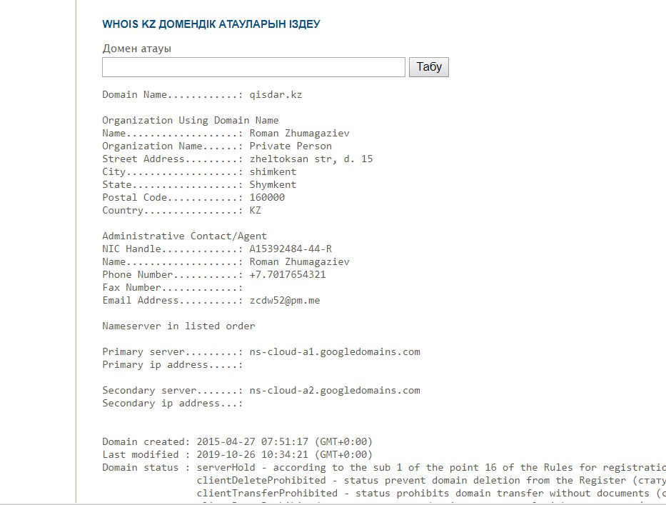 Так, согласно данным Казахского центра сетевой информации, к примеру, неупомянутые в списке домены izdar.kz и qizdar.kz зарегистрированы на некоего Романа Жумагазиева из Шымкента (на него были зарегистрированы домены из представленного выше списка yzdar.kz и qisdar.kz).