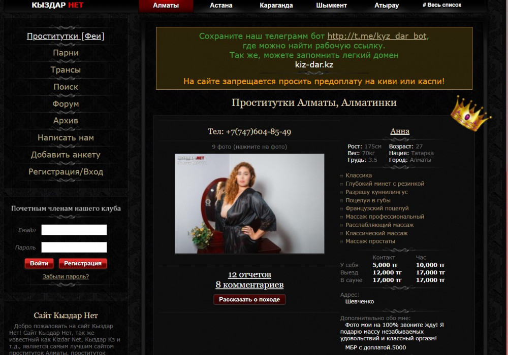"Представленные интернет-ресурсы ww.kizd-ar.net; ww.qizdar2.com; ww.qisdar.kz; k.yzdar.kz; ww.kyzdar.com; w3.kizdar2.net; kizd0r.net; qyzdarai.net; k1zdar.kz; feika.org; best.konfetki.club; relaxation.pub; kaz-girls.net ; astanink1.com; don-m.net; qznova.kz были признаны противозаконными комитетом информации МИОР. На сегодня в казахстанском сегменте Интернета доступ по вышеперечисленным ссылкам ограничен".