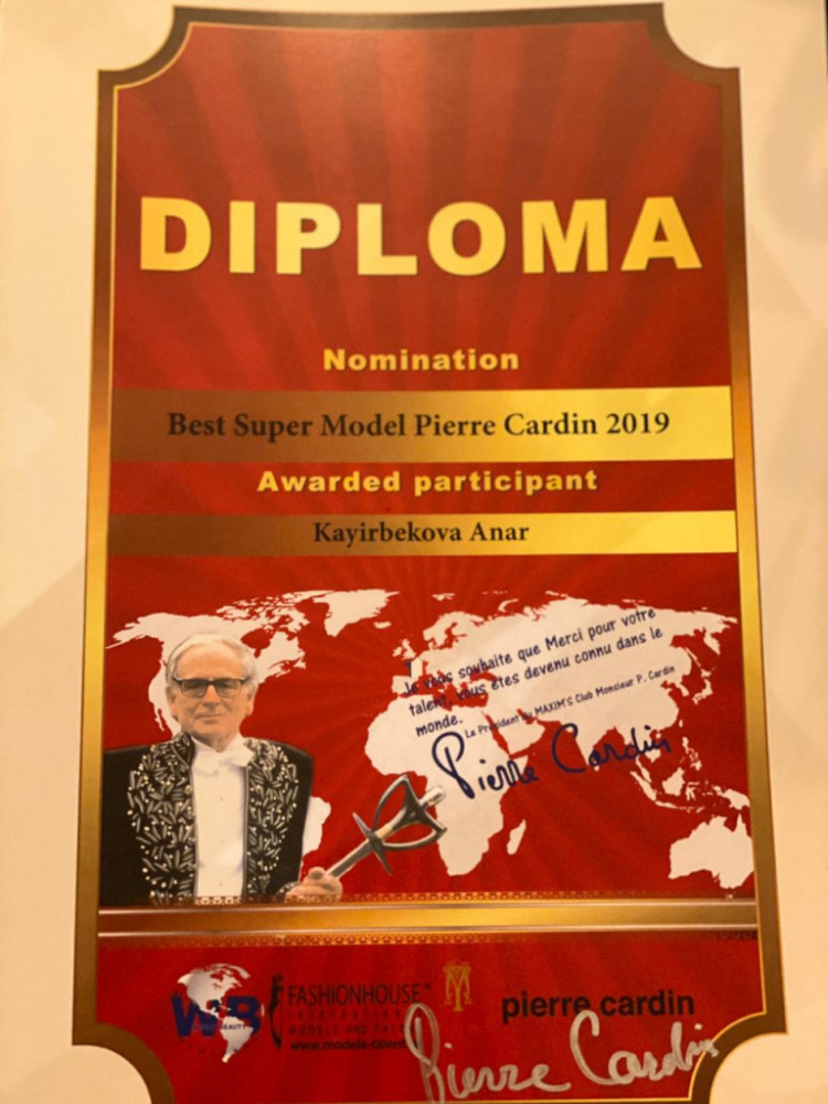 Во французской столице Анар Каирбекову ждал еще один триумф. Карден удостоил ее диплома "Best Super Model Pierre Cardin 2019".