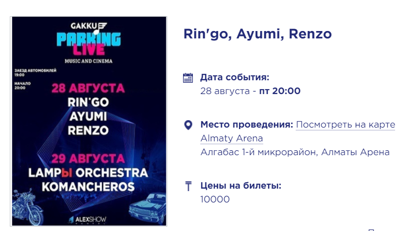 К примеру, 28 августа на территории Almaty Arena выступят группы Rin'go, Ayumi, Renzo. А 29 августа состоится концерт групп Lampы Orchestra и Komancheros.