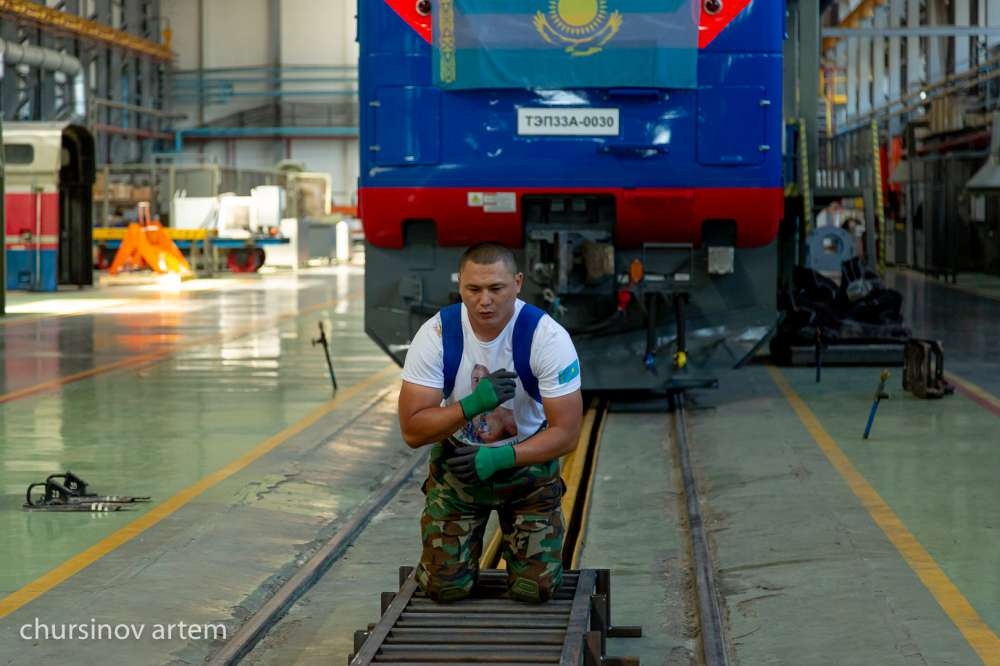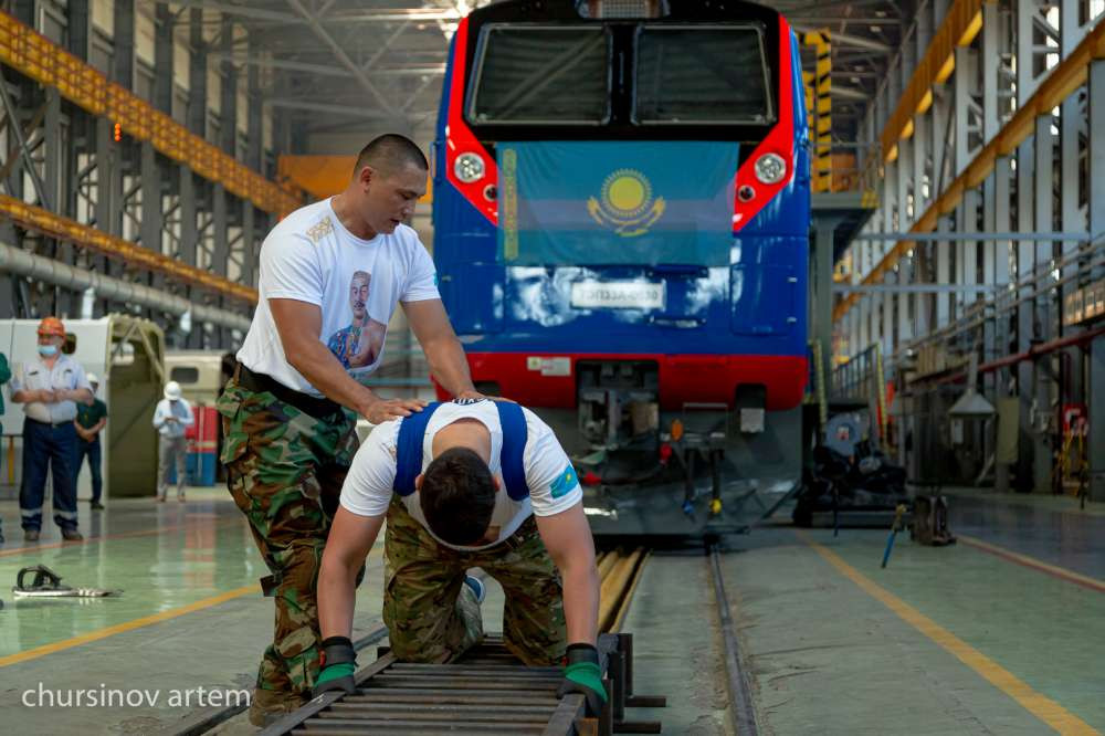 Таким образом, палуанам понадобилось три месяца на подготовку. Они занимались на базе завода АО "Локомотив құрастыру зауыты". Изначально начинали со средней весовой категории. Это вагоны, которые весят 96 тонн. Затем перешли на более тяжелые весовые категории - вагоны весом 123 тонн. Но эти цифры их не остановили. Поэтому они решили тянут сразу два локомотива весом 276 тонн.