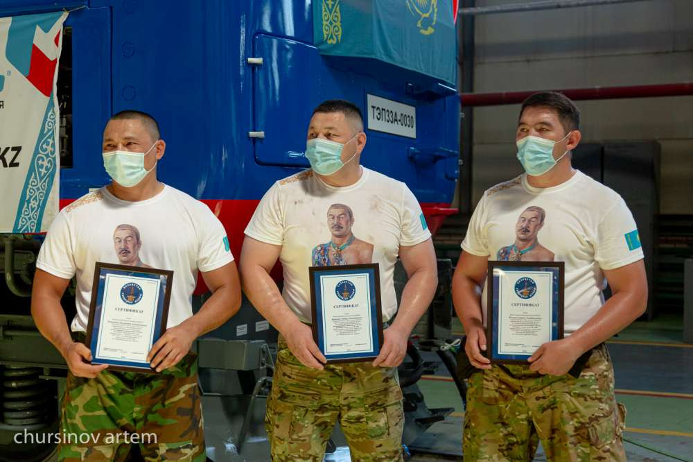"Мы сегодня стали свидетелями уникального события, когда установлен мировой рекорд и одновременно побит рекорд Казахстана в силовом экстриме по перетягиванию локомотивов. Это большое достижение и данные виды рекордов нигде не установлены. В нашей стране спортсмены одни из сильных по силовому экстриму. Уникальность сегодняшнего рекорда в том, что трое спортсменов одинаково повторили свои достижения. Более того, побит рекорд 2018 года, который был также установлен казахстанцем Сергеем Цырульниковым. Он протащил несколько метров тепловоз с вагоном весом в 148 тонн. Сегодня же это два локомотива весом в 276 тонн, длинной 44 метра на нулевой поверхности. Вы сами видели, что спортсменам не просто далось установить рекорд", - рассказал Куандык Кудайбергенов.