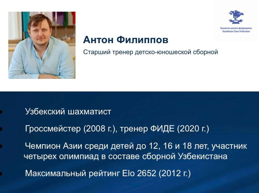 "Антону есть, чему научить ребят: он чемпион Азии среди детей до 12, 16 и 18 лет, сильный гроссмейстер, участник четырёх олимпиад в составе сборной Узбекистана. Антон много лет живёт и тренирует в Алматы, в настоящее время ожидает получения казахстанского гражданства", − сообщил Дармен Садвакасов.