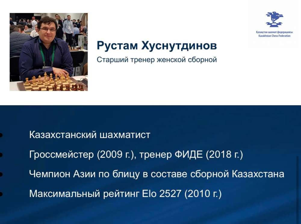 Старший тренер женской сборной − казахстанский гроссмейстер Рустам Хуснутдинов из Караганды. По словам Дармена Садвакасова, у Рустама накоплен существенный опыт работы с молодыми шахматистками, есть серьёзный пласт теоретических наработок.